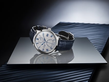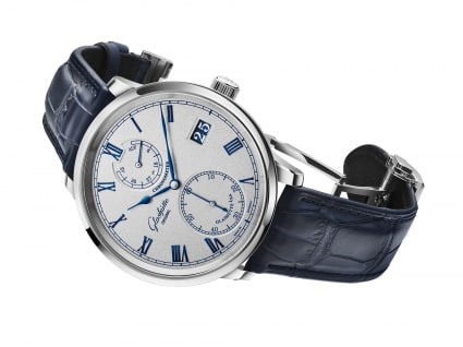 Dial material brass; frosted silver plated, electroplated gray, solid gold with blue coating, inlaid Roman numerals, orbital scale ring, blue printed fonts; blue steel hands
